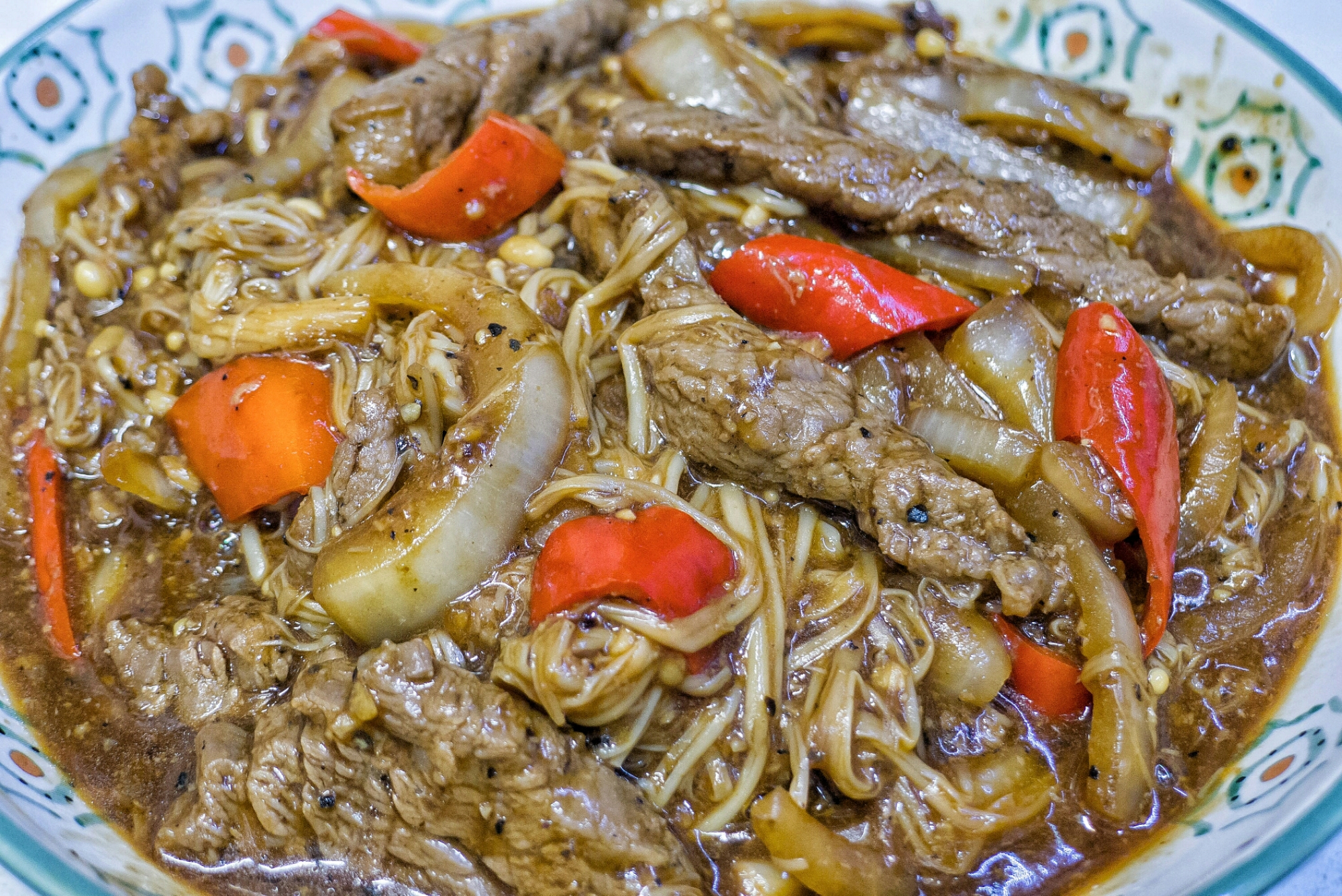 - 牛柳洗凈,瀝乾水份,切成條狀,加入醃料,醃約15分鐘;洋蔥切粗絲;紅尖椒切小塊;金菇切去尾部,洗淨並瀝乾水份,分成小束